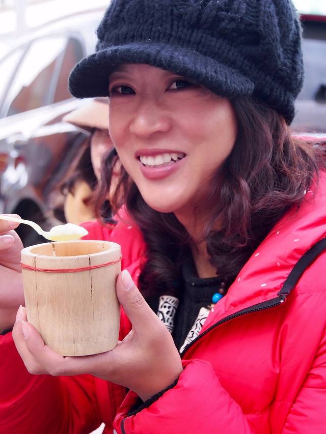 朋友推荐的布达拉宫邮局对面的钟阿姨纯手工酸奶,雪白的固体酸奶装在雕刻有花纹的小竹筒里售卖,十块钱一杯,青海风味,浓厚酸醇,二十六年手工好酸奶,确实纯正。大家全部围坐在摊前吃酸奶,饶有趣味。