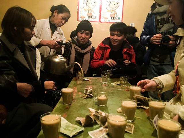 在大众点评上找了一家藏餐厅,五星好评,而且还藏族歌舞表演。可是按导航,打电话,一行人愣是没找到地方。于是,就近选择了一家,纯洁阿妈拉藏餐厅。虽然没有歌舞,但是服务还是非常周到的。来西藏第一次到藏餐馆吃中餐,第一次喝酥油茶,第一次喝咸的甜茶,第一次吃糌粑,第一次学会吃糌粑。酥油茶和糌粑都能接受。