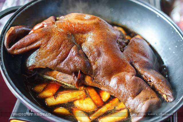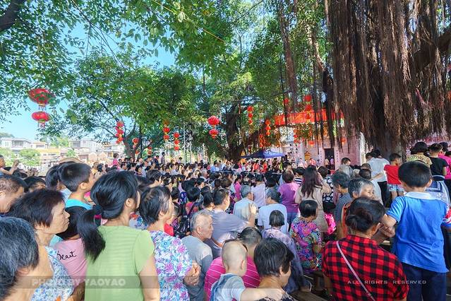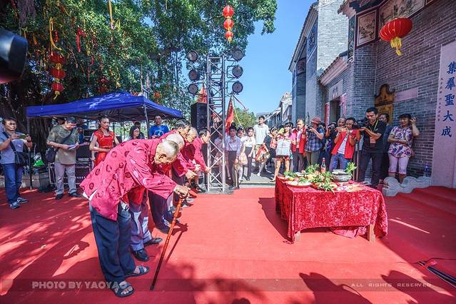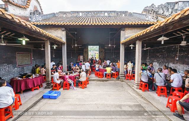 这顿“翰林宴”设置在村内的祠庙里,吃的是传统的“盆菜”,一盆是“猪面”(即猪头其中一半),另一盆是有鸡、鸭、莲藕等材料混合在一起的“大盆菜”。每桌也是满人才开桌,大家一起品尝地道南海美食,一边谈笑风声,好不热闹。