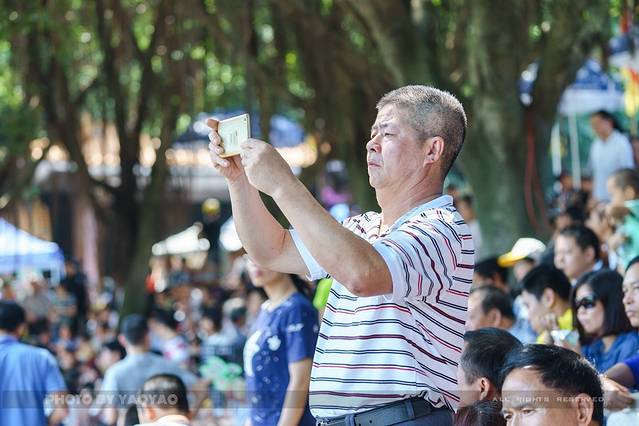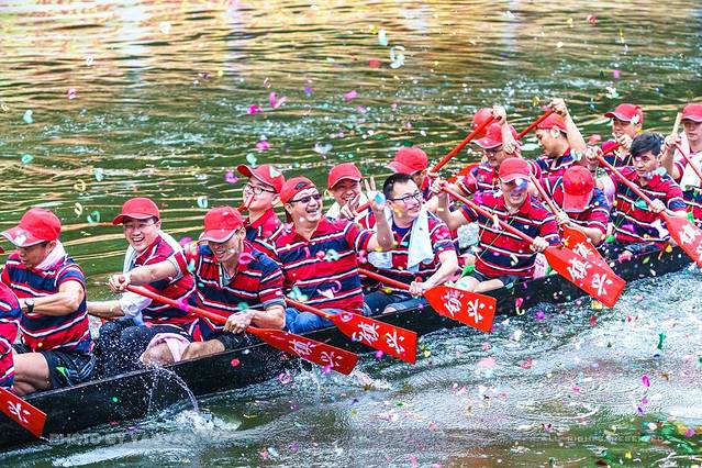 当比赛一开始,九江涌上52支龙舟队进行31场速度与实力的比拼,两组队伍在奋力划浆,现场的锣鼓声、呐喊声、欢呼声交织在一起,形成了九江独有的国庆龙舟乐章。放眼远看,河涌两岸早已人头涌涌,挤满了前来观赛的市民,场面极为壮观。
