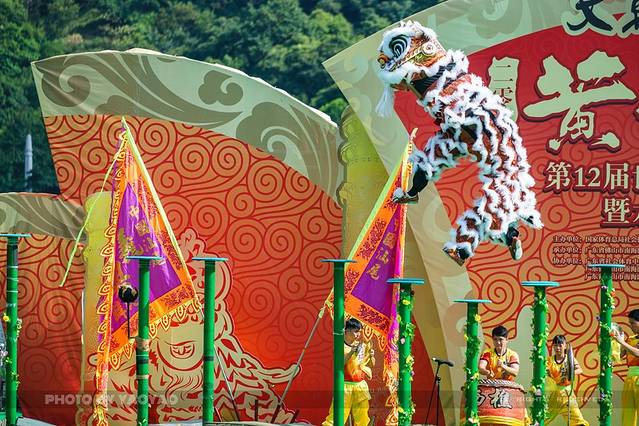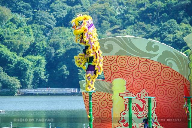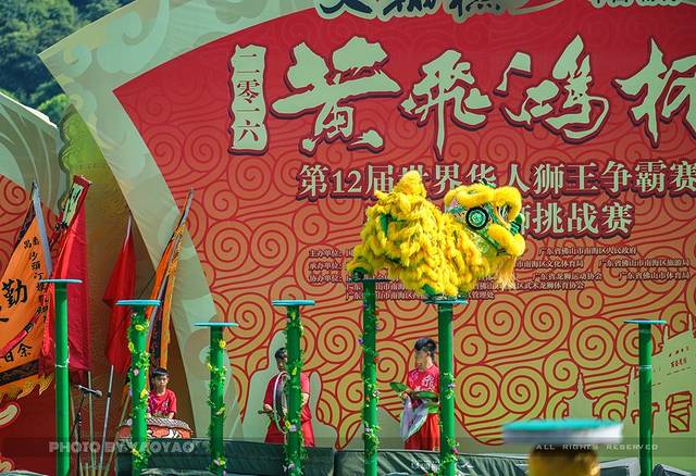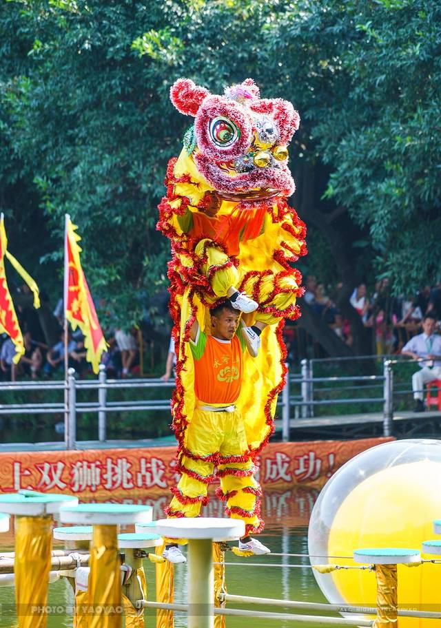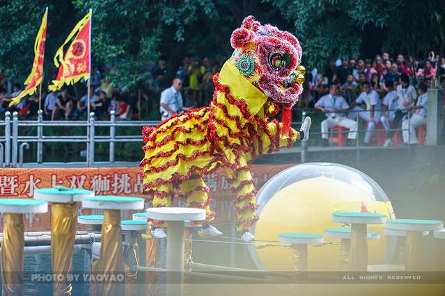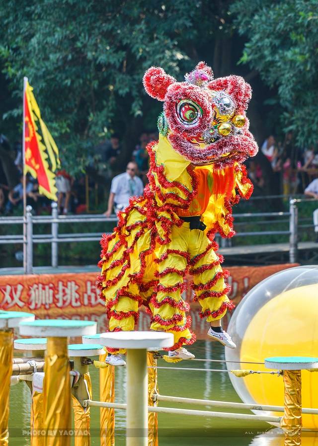 整场狮赛是在西樵山天湖公园的水上擂台开战,整个赛程分两种形式:南狮陆地高桩、和水上双狮对决战。