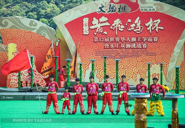 10.2日下午,在南海西樵山的天湖公园举行了“黄飞鸿杯”第12届世界华人狮王争霸赛暨水上双狮挑战赛。