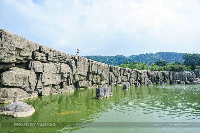 听音湖片区位于西樵山西北山麓,当中最有名的景点便是这个【樵山瀑影景】了。这个瀑影景设在上湖锦湖与下湖听音湖之间的湖堤中,瀑布宽广如帘,远处观赏,苍绿的樵山为背景。