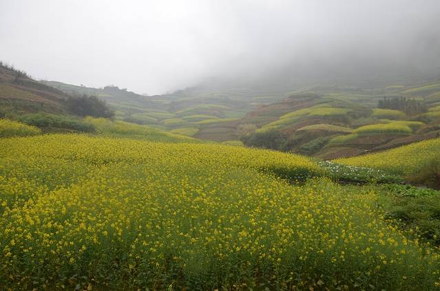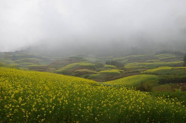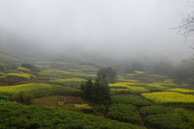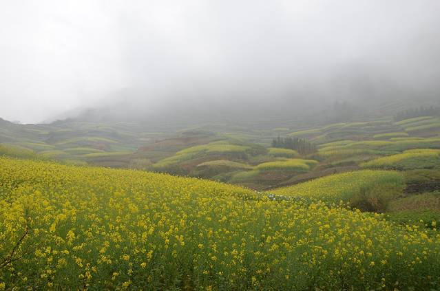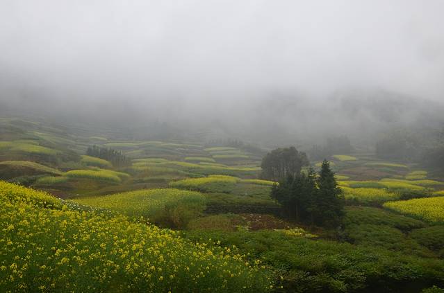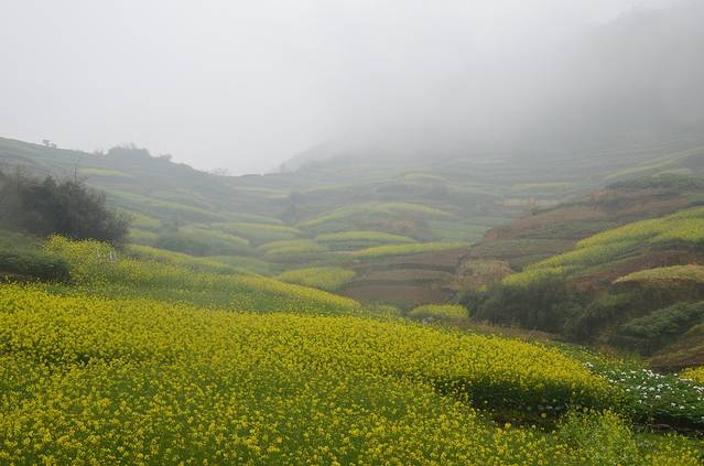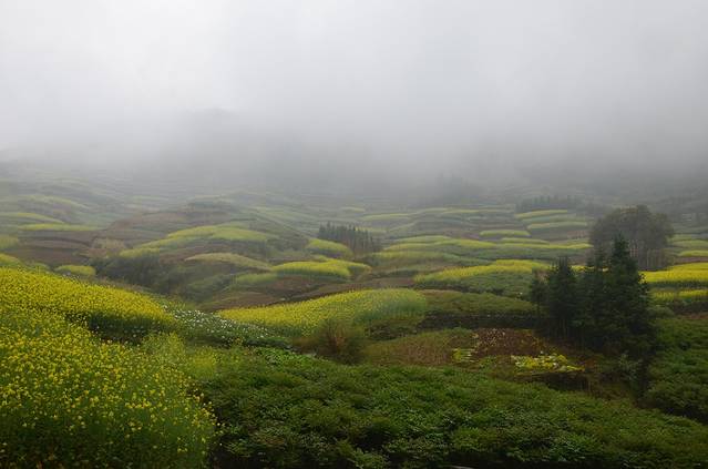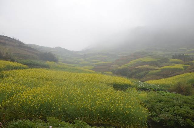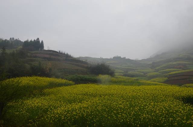 这就是那片油菜花,长在一片山坡上,抬眼观去,一片片嫩黄嫩黄的油菜花,层层叠叠的装点着这片山坡,由于是雨天,远处雾气袅袅,宛如仙境。这比任何景点给我带来的感觉更让我觉得惊喜。