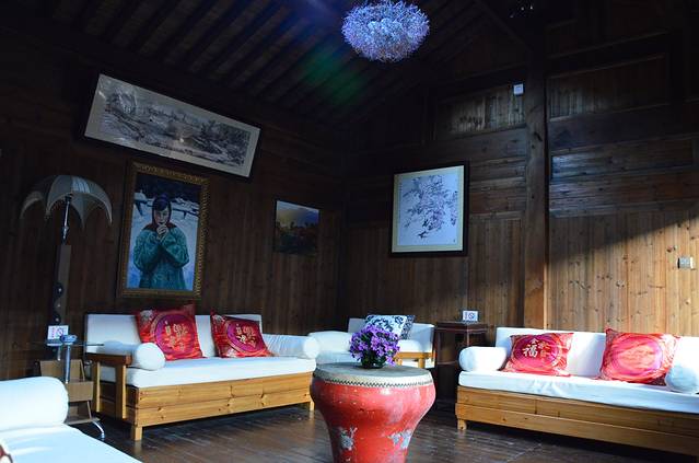 据说这间老宅子有100多年了,房主花了几百万买下来,目的不是为了开客栈,是为了老房子住着有人气才不会旧。从他的房间布局确实可以印证这点:房间不多,而且客房外边就是几户共用的一个布置考究的大客厅。要是唯利是图的话,完全可以改造出2个房间