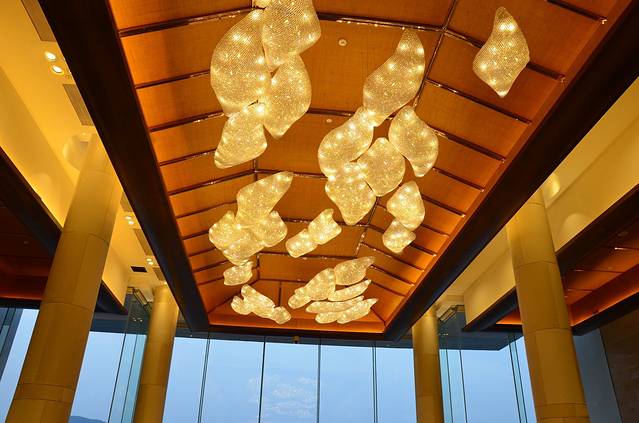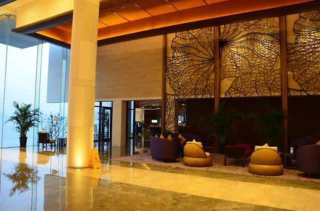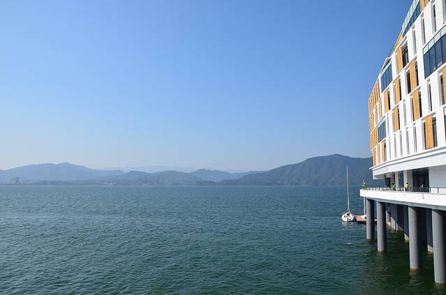 透过大堂玻璃能看到傍晚的湖景,不过没有白天漂亮