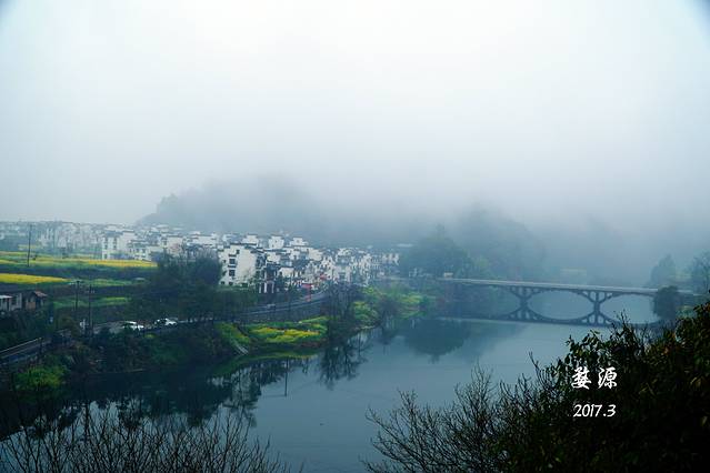 观景台对面就是汪口村,下雨的日子,让晨雾久久散不去,可正式这样,让眼中的徽式建筑更具有南方的味道,烟雨蒙蒙,雾气昭昭,溪水迢迢,黄花袅袅。