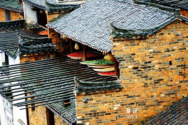 屋檐下花花绿绿的作物,会在不下雨的日子被推到木棍之上,被称为经典的晒秋人家之景