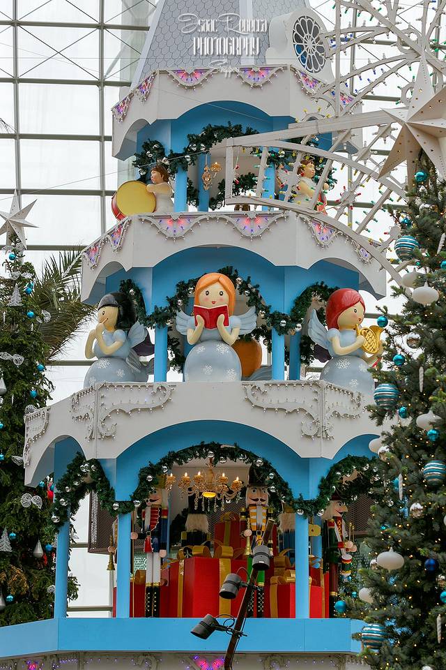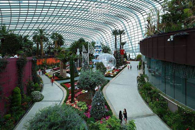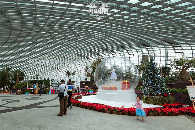 一进入花穹,还别说,真的是冷室,所以外套一定要带啦,要不然室内外温差会有点大,小朋友可能会受不了。当然要在四季如夏的地方建造一个四季如春的环境那温差是必须的了。年关期间来新加坡有个好处,哪里都有节日的气氛,花穹也正好是圣诞主题,洁白纯净又显得很喜庆。