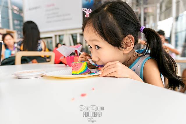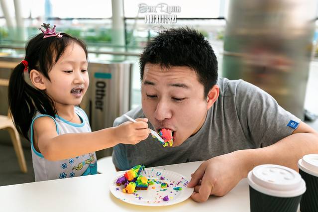 然后,孝顺女儿就开始给她老爸喂食了,一口接一口,还没咽呢又来一口,我应该庆幸没直接拿蛋糕盖我脸上吧
