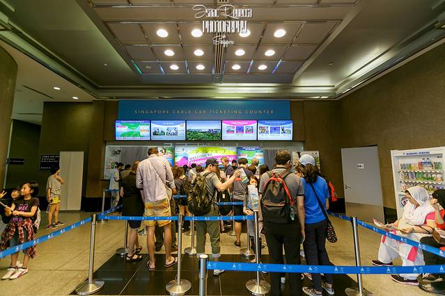 去圣淘沙的方式最常见的有两种,一种是缆车,一种是转圣淘沙地铁。我们选择缆车可以鸟瞰下风景。地铁坐到HarbourFront出站跟着指示通过VivoCity二楼一路走,一路会有cable car的指示牌,一定一定不会走错。首先来到售票处购票,购票处出售到达各个站点的票,同时也可以连着景点门票一起买。提前买了S.E.A.海洋馆的门票,就直接买了到merlion的往返。