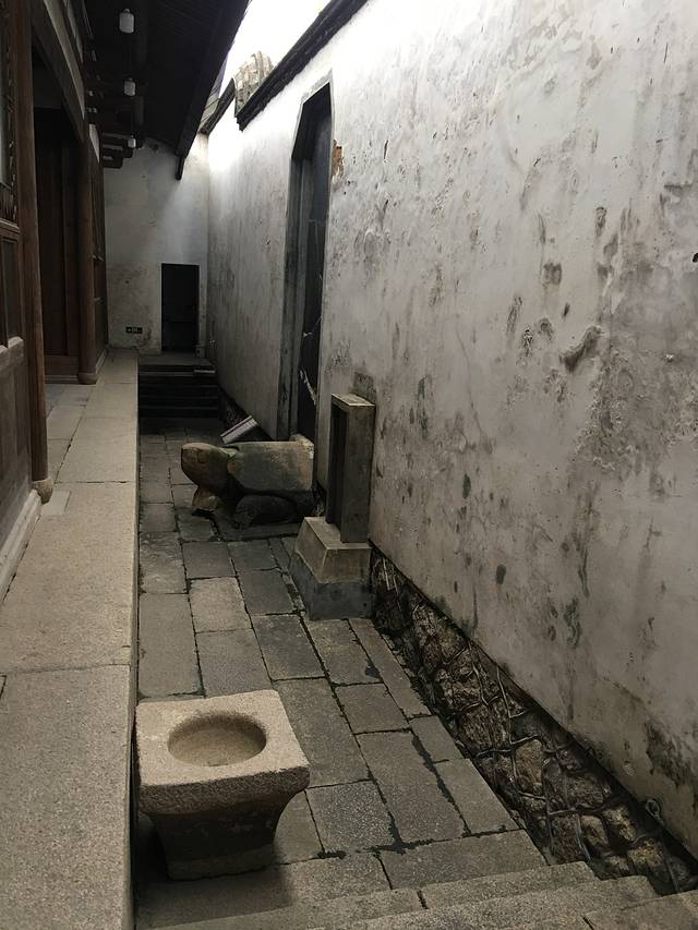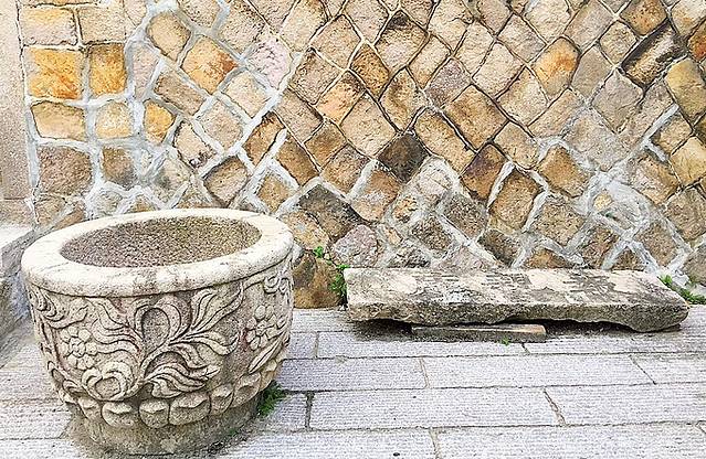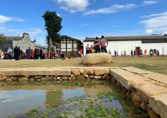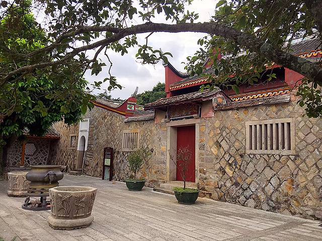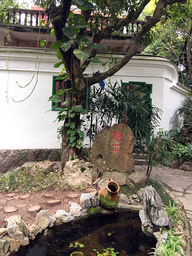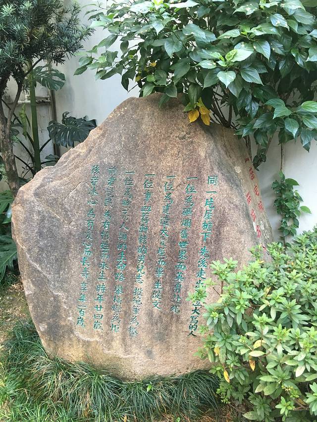 在补山精舍内可以看见这么一方巨石,形似武将头盔,石头顶上有一莲式须陀座石塔。