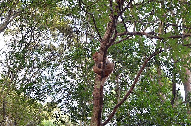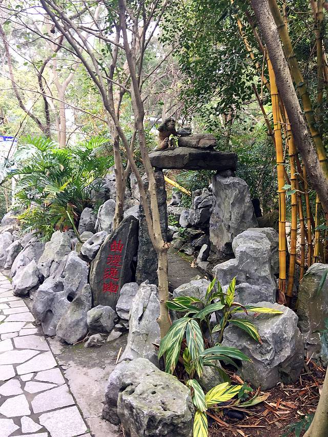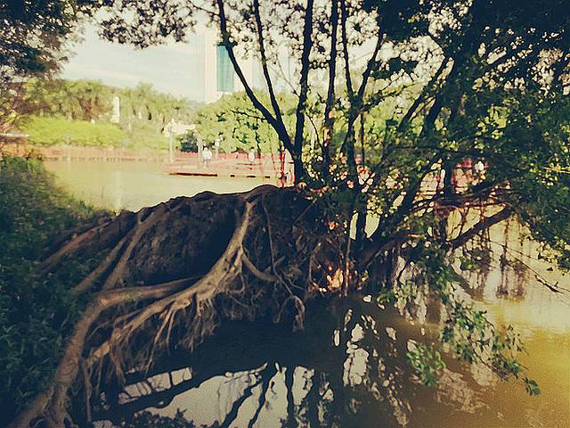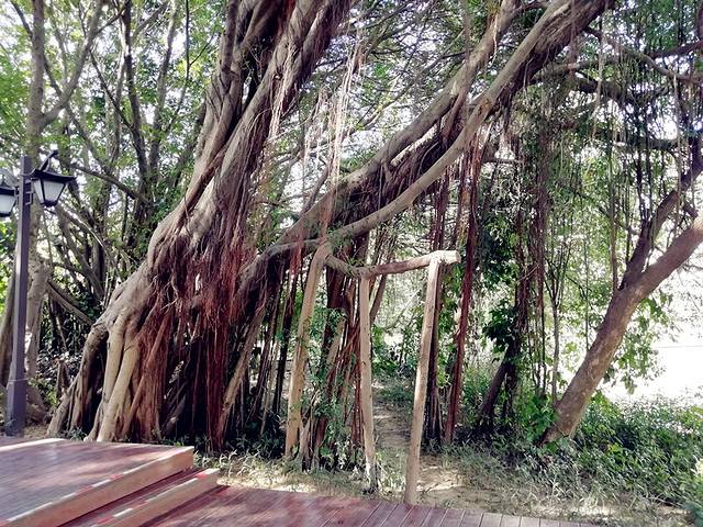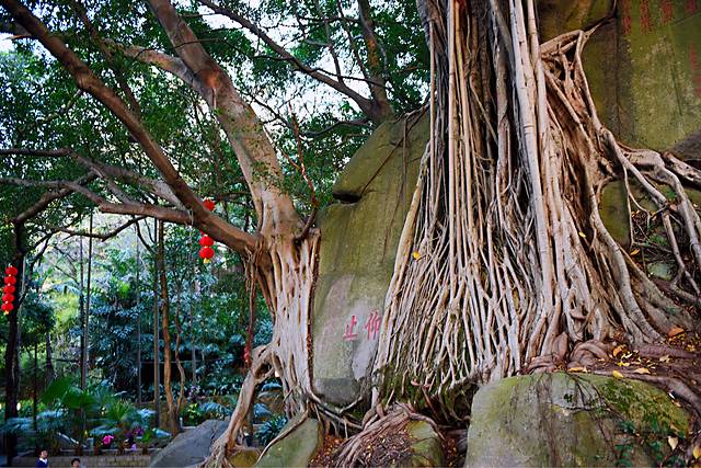 狮子岩的美主要还在于岩顶上附生的一株大榕树,根须造型独特,盘错虬结,纠缠在岩顶之上,远远望去象雄狮飘逸的鬃毛,故得名“狮鬃榕”
