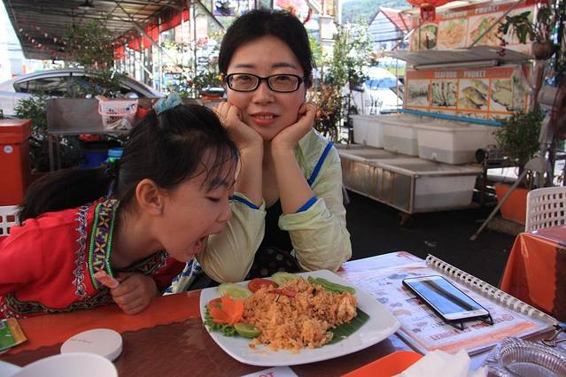 收拾完再出来,太阳已经快落山了,2月的普吉岛在这傍晚时间着实非常舒适,温和的温度,微微的海风,让人感到十分惬意。步行到6号餐厅,被排队的人吓着了,所以就近找了家餐馆就坐下了,味道还不错,也没让我们失望,小侄女下午玩的太猛,直接趴在餐桌上就睡,直到我们吃完都不肯起来。