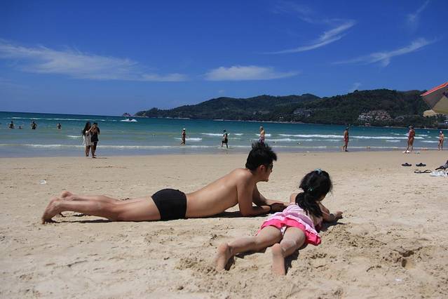 我们从酒店步行过去大概花了10分钟,海滩免费,而且附近1分钟的地方就有卖水果、小吃之类的,也有7-11,价格非常公道。海滩有租遮阳伞的,100泰铢一天,说实话如果穷游就在海滩上游游泳、晒晒太阳、吃点水果小吃,真的花不了什么钱。我们家小姑娘见着海就疯了,开心的一直玩一直闹,所以我们整个下午就在芭东海滩吹风、游泳,及其惬意。