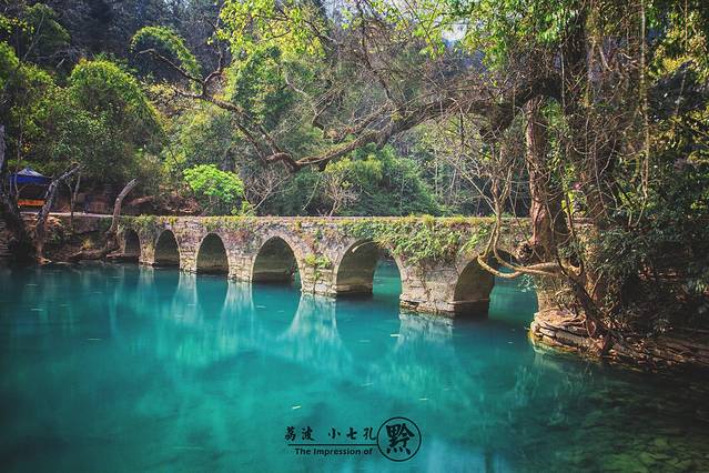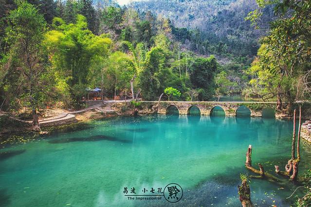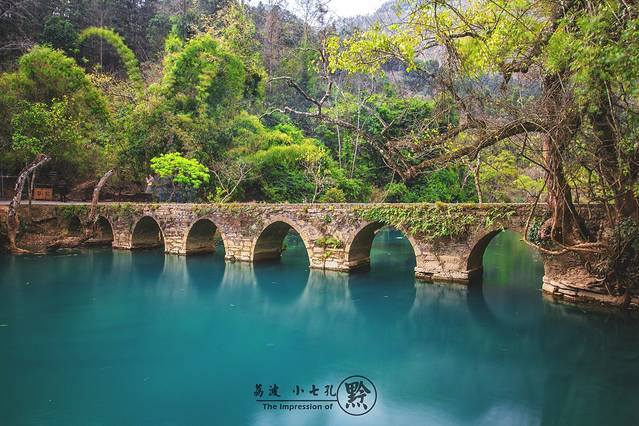 七孔的重头景就是七孔拱桥,“小七孔景区”也因此得名,而走过了这座桥就到达了另一个省份----广西,湖蓝的平静湖水上面立着一座青石砌成的七孔拱桥,还有一段凄美传说,曾经有一对情侣相恋于此,但迫于外界的压力,她们不能朝夕相依的执手偕老,为了爱情,他们最终决定逃离这里,携手天涯。可当逃离到七孔桥,汹涌的大河却阻挡了他们的去路,正在他们准备跳河殉情时,被他们真爱所感动的七名仙女幻化出了七孔桥帮助他们,但同时,仙女告诉他们,这座桥凝聚着时间和命运的力量,他们每走一步,便会衰老一分,代表着他们走过一年,当走过七孔,他们苍颜老矣,但也代表着他们共度了一生。最终,在七孔桥上这对情侣牵手而过,虽然只有短短百步,但他们却如愿的执手偕老,无怨无悔。