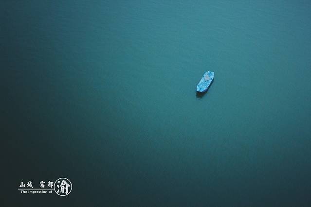 蓝绿色的嘉陵江上,一艘小船孤零零的漂着。