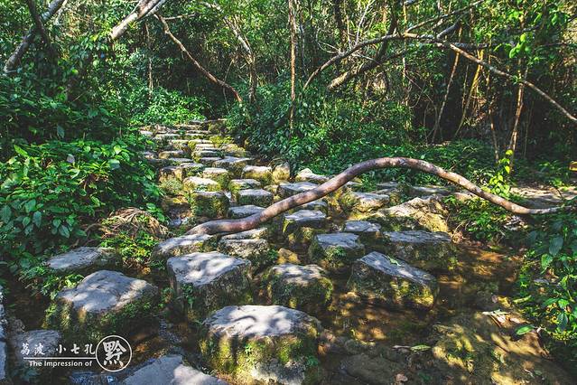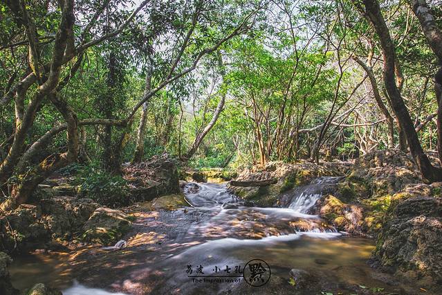 这里的千百株树木,包括珍奇树木数十种,全都植根于水中的顽石上,又透过顽石扎根于河床,造就了这幅水中有石,石上有树,树植水中,水、石、树相偎相依的奇景。