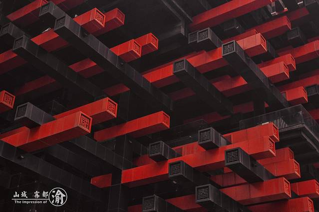 建筑中的“题凑”互相穿插、叠落、悬挑的构件高高迎举,顺其自然,力图体现中国建筑的视觉冲击力和雕塑感。设计所追求的特殊肌理效果也正是重庆人最本质的精神追求。又以传统乐器“笙”为文化的载体,在现代富有活力的都市生活中,创造歌舞“笙”平的和谐形象。整个建筑如同点燃的红色篝火,在欢乐的燃烧;鲜红的颜色代表着中国的传统颜色、富贵吉祥,又如同重庆的红油火锅,表现出巴人刚烈率直、热情好客的性格特征。