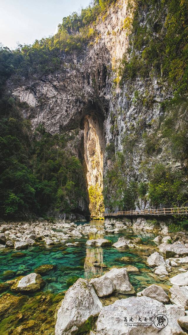 大七孔景区最为代表的景点就是天生桥了,它是一座大自然鬼斧神工凿造而成的天生桥,也称为“东方凯旋门”。桥高60米,桥孔宽20米。整体来看比较壮观,外加下面的河水,那颜色犹如宝石一般,犹如九寨的水一样,在山洞里十分凉爽,山风很大,而且路比较窄,桥下湍急的水流形成一道瀑布,桥孔下遍布形态各异的钟乳石。