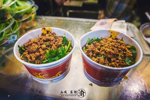 有些时候不太清楚一个地方什么才是大众最喜欢的,经验告诉我们排队最多的大部分是最好的,在解放碑附近有一家酸辣粉,当然算不上当地的特色,但终究是一个以辣味主的小吃,说实话给我的第一感觉就是它的辣盖住了所有味道,一份粉不多,水倒是喝了好几瓶。