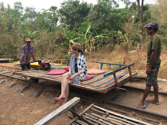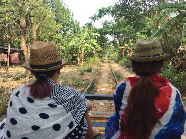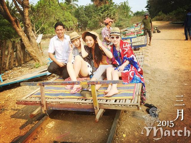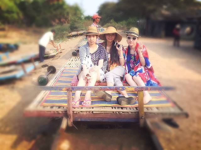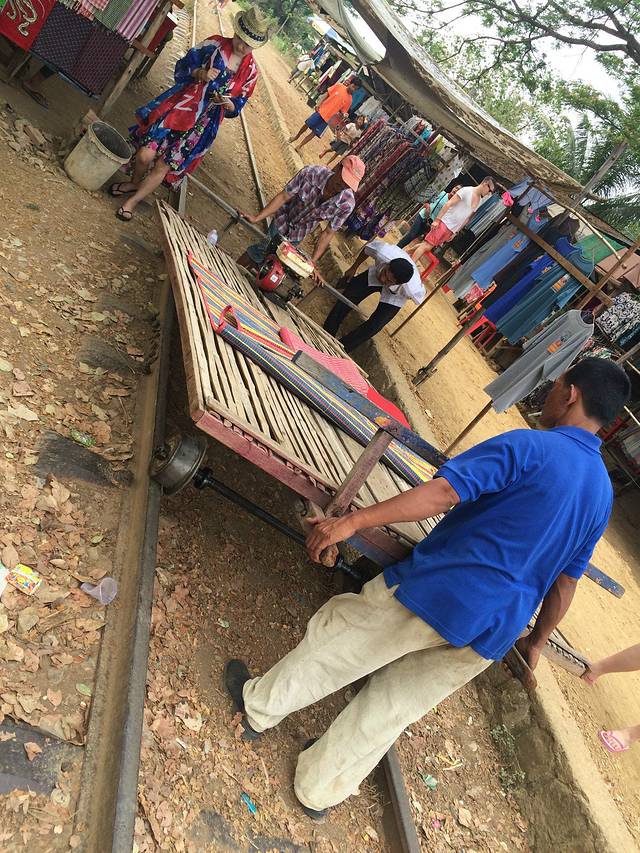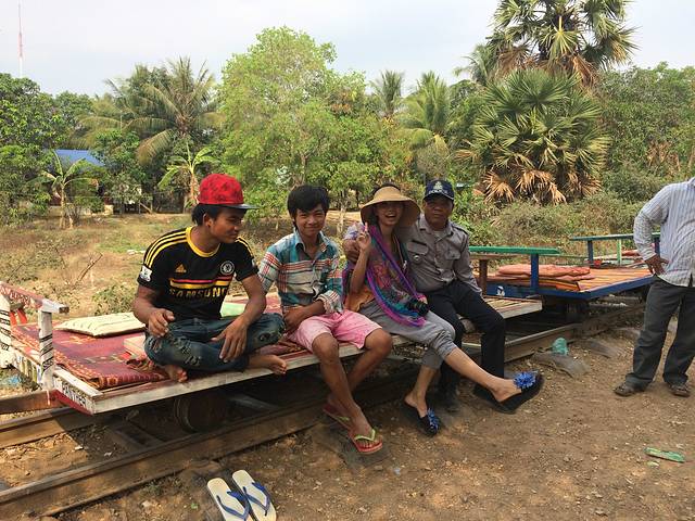 这样一路睡睡觉,吃吃饭,下车拍拍照,聊聊天,一会就到马德望了,准备坐竹火车了,好激动啊,5刀一车,司机师傅也没有坐过,我们就要求他一起,一路他也拿出硕大的手机自拍,哈哈哈自恋男啊!