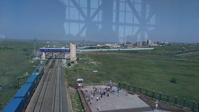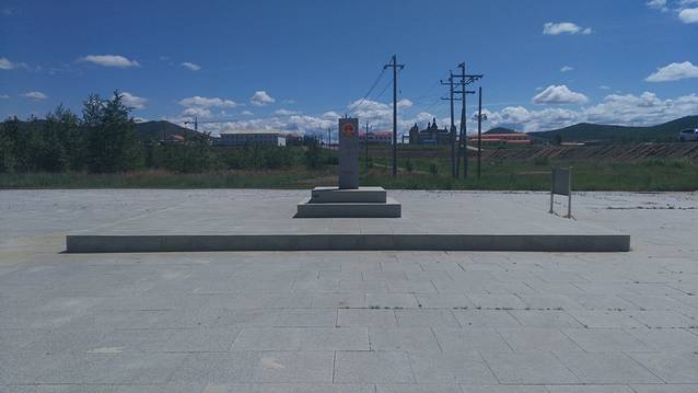 登上国门,对面就是俄罗斯的国门了,正好有辆火车经过,右下方是另一块界碑