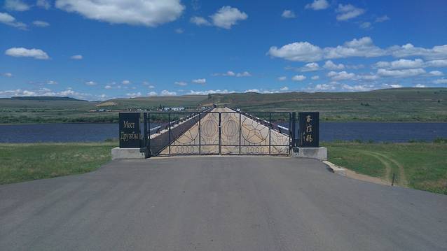 中俄友谊桥,对面就是俄罗斯的一个村庄了,这条额尔古纳河也是中俄的界河。这里可是有兵哥站岗的,平时是给往返的货运卡车用的,往返的战斗民族人民还是很友好的嘛~