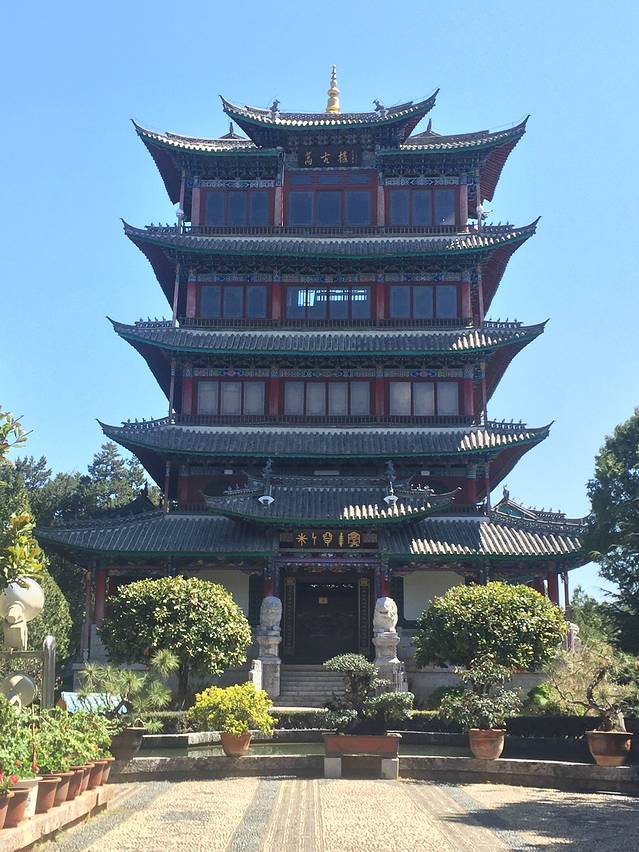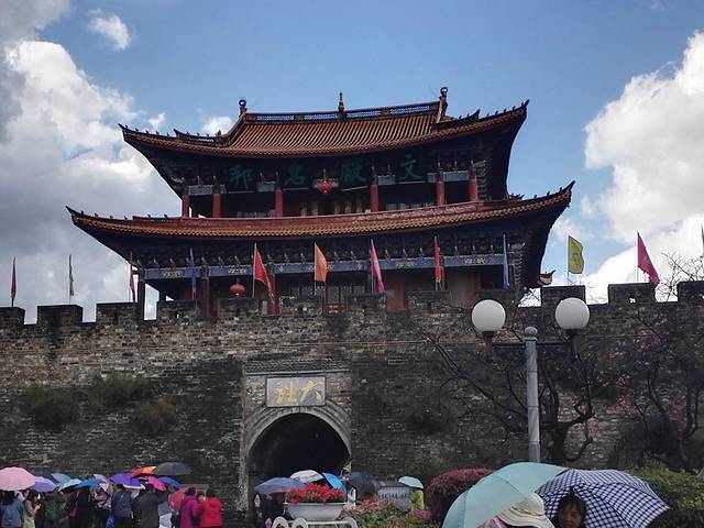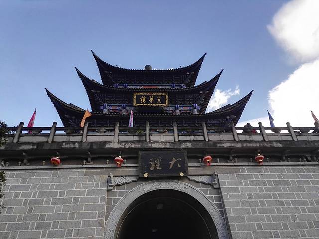 五华楼位于大理古城内,古时是南诏国王接待宾客的地方,后来几经兴废,最近一次在1998年重建。五华楼是古城内最气派的建筑之一,可以登楼远眺苍山、俯瞰古城区,也可以留影拍照,尤其夜晚时五华楼华灯初上,非常漂亮。 五华楼现在高三层,下面是可以过人的门洞,门洞上挂着写有“大理”两字的匾额,在这下面合影是很多游客一定要做的事情。在五华楼周围,目前已经形成了一定规模的书画市场,周围的店铺都以销售书法、国画等艺术作品为主,感兴趣的可以去看看。