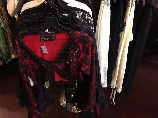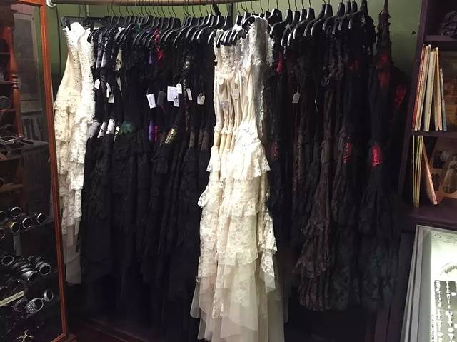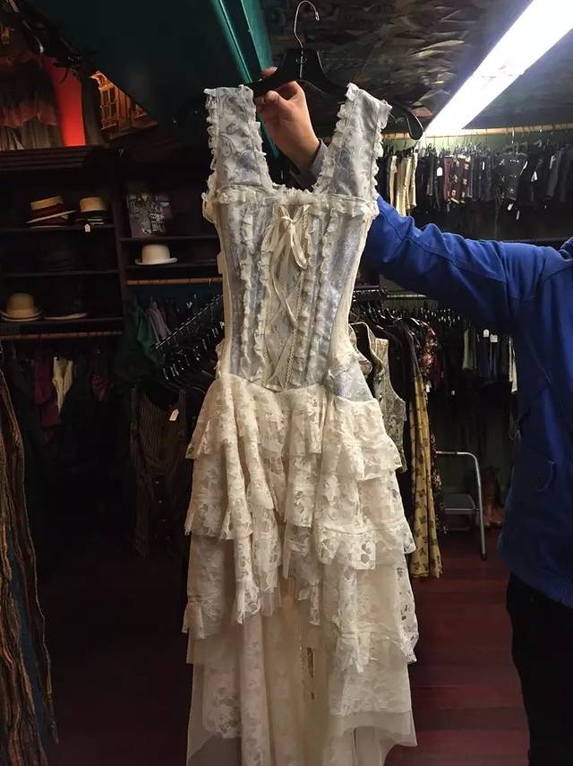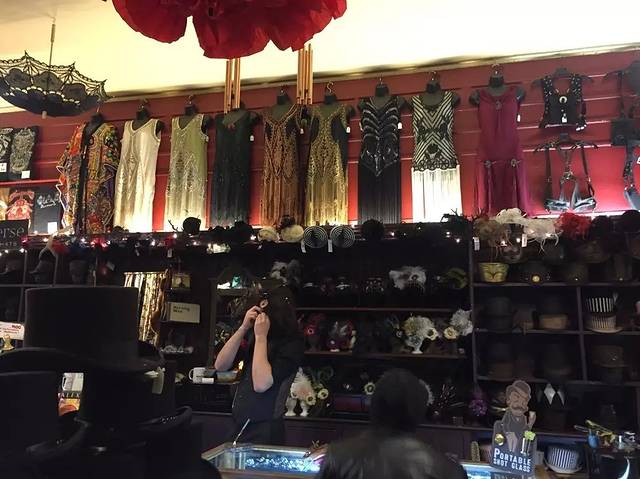 这是一家古着店,如果你看过了不起的盖茨比,一定会对上面一排挂着的那些衣服不陌生,另外各种面具,柜台前的小哥此时正在试戴一个鹰嘴的面具。