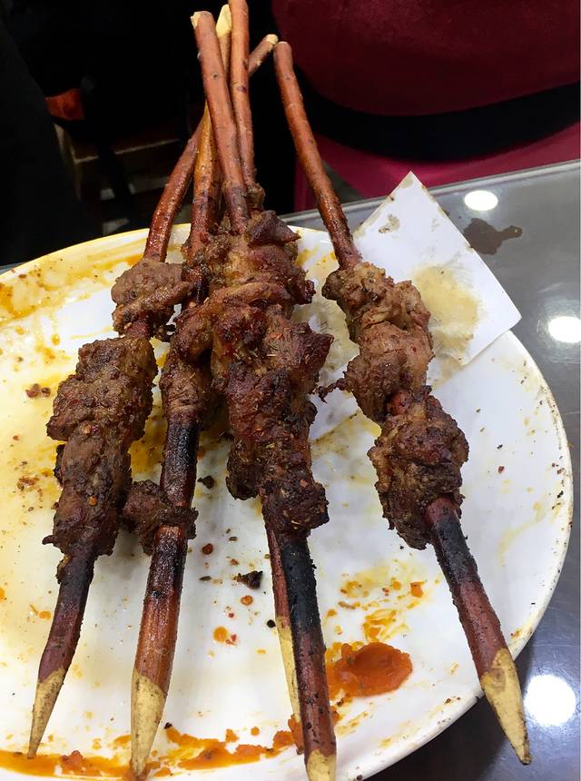 这里的烤肉串用柳树枝串的,很粗犷🙆,味道不错哦!✨