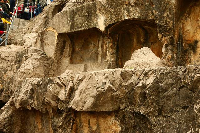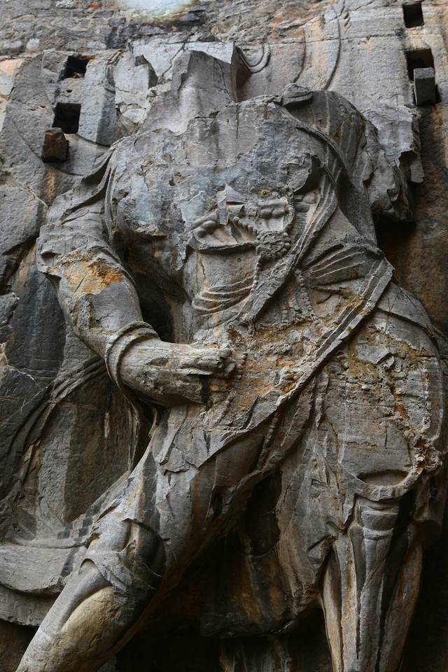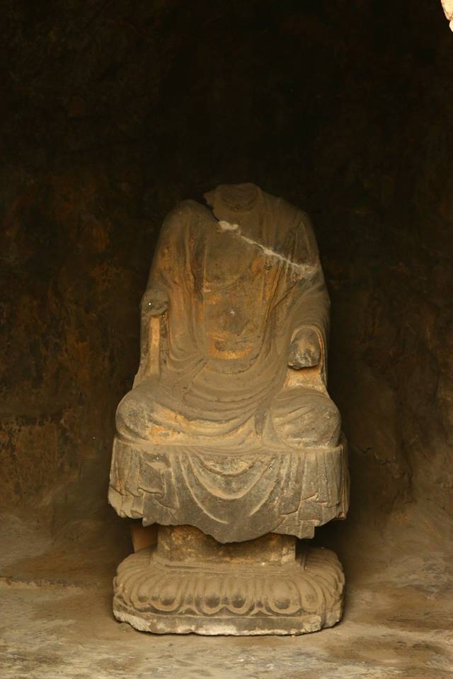 据说在古时,东山石窟的规模比西山石窟还要大,曾有“西山一山,不如东山一湾”的说法。只是,往日的繁华早已消逝,现时的东山已彻底衰败,游走东山石窟,就好像是在锻炼爬山,爬上好长一段山路,也难得能见到一座成形的雕像。东山崖壁上的石窟,全是唐代的窟龛,其中大、中型洞窟有20个,虽不及西山石窟繁多,但也属精品。
