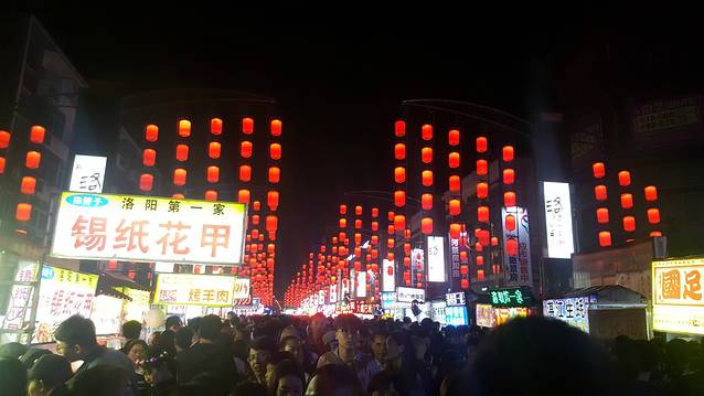 这人多的,根本就没法逛沿街的各种店铺 只好随着人群向前走,但是高记不翻汤还是一定要品尝的,确实是非常非常不错,但是一定要认准了,因为这一路上,同名的不翻汤店非常多,真正的这家店从丽景门走进来需要一段是路程,招牌一定要认清楚,这家的不翻汤店也是络绎不绝,但是口味非常不错,用料也足,配料有绿豆粉、胡椒、味精、酱油、醋、木耳、粉丝、海带、虾皮、紫菜、韭菜、锦珍、食盐。 用小勺舀一些稀绿豆面糊往平底锅里一倒,即成一张类似春卷的薄片,不用翻个就熟,所以就叫“不翻”。把两张晶莹翠绿的“不翻”叠着放在碗里,舀些滚烫的猪骨头汤浇在上面,再放上些粉条、黄花、木耳等,还要舍得放些醋、胡椒粉,于是一碗不翻汤就做好了。这个汤吃到嘴里时,“不翻”软绵不化,嚼之有豆香;汤酸辣清淡,余味悠长,是洛阳本地人吃夜宵的首选 .其特点是味道纯正、酸辣利口、油而不腻。