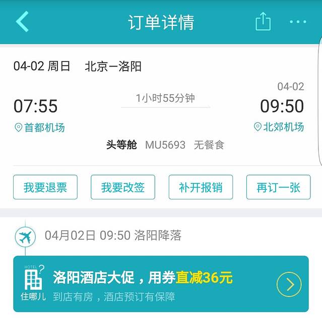 从北京到洛阳有两种方式可以到达,飞机和高铁,都非常方便,飞机1小时30分钟,高铁4小时,都是非常方便的旅行,但是在四月又是清明节,所有的票都是非常不好买,去洛阳,高铁其实是首选,时间不算长,准点方便车次多,其次是飞机,快捷便利机场距离市中心也近。我们原定是高铁往返,可是我一大早用手机在去哪网抢票,结果在开放抢票的一瞬间,清明节当天所有高铁车票全部卖完,当时心中翻涌了无数句“家乡话”!一点不夸张,一瞬间,一秒钟,所有车次,所有座位全部卖完!真是太神奇,太快了!所以我当时就怒买北京到洛阳头等舱机票两张!除了价格贵,时间,服务,行程安排都没毛病,而且还提前到达,从洛阳回北京因为没有飞机航班,还好买着高铁票了!