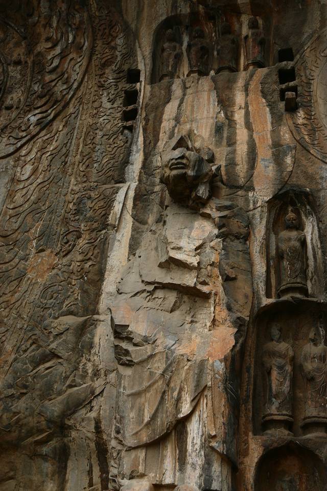 奉先寺位于龙门西山南部,是龙门石窟中规模最大、最具有代表性的露天佛龛。主佛卢舍那高17.14米,是龙门石窟中最大的佛像。这尊佛像身披袈裟,面容丰满,嘴角微翘,略含笑意,眼帘低垂,宁静的目光蕴涵着无穷智慧,流露出对尘世的关怀。端庄大度、淳厚安祥的仪态令人不得不肃然起敬。要说龙门石窟最经典的景点,非奉先寺莫属,一度成为龙门石窟的代表,奉先寺建于唐高宗初期,皇后武则天赞助,所以也有人说,这尊佛像是照着武则天的样貌雕琢。奉先寺也就是卢舍那大像龛,顺着河边一直走来,是看不到卢舍那大像龛的,看到上面的牌子时,就需要顺着台阶爬上去,奉先寺原名就是“大卢舍那像龛”,是龙门石窟开凿规模最大的摩崖像龛,也是全国石窟中唯一劈山开崖、依崖建造的大型群雕。整个佛龛造像布局为一佛、二弟子、二菩萨、二天王、二力士一共九尊佛像。