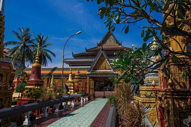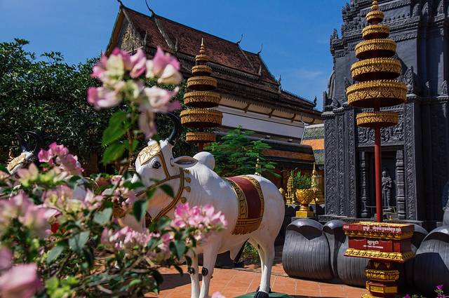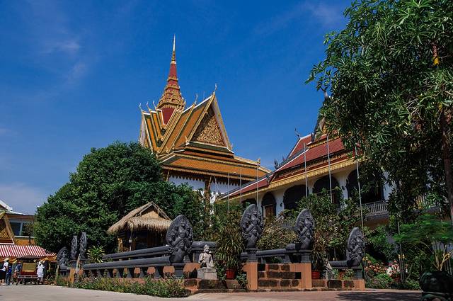 买完明信片我们就沿着暹粒河向邮局进发。走几步路就能看到Wat Preah Prom Rath的围墙,砖红色的围墙上写满了金色的经文,院墙上还装饰有许多佛像,非常好看。