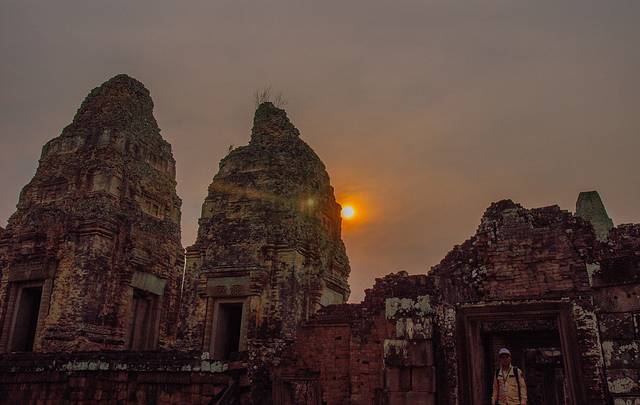 今天的最后一站是比粒寺观日落。比粒寺也称变身塔,是古代皇族进行火葬仪式的地方,和女王宫是同一时代的建筑,是红砖石头混合建筑慢慢向全部石头建筑过渡的重要阶段。我们是从东边的门进入的,抬头一看日头已经开始低垂从塔尖处投射出光芒,由于是塔身是红砖,在暖黄光芒照耀下特别有种即将没落的辉煌的感觉。