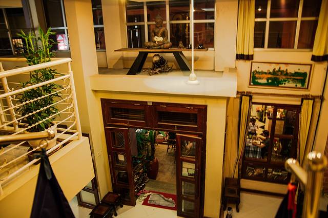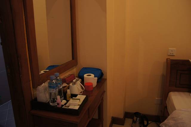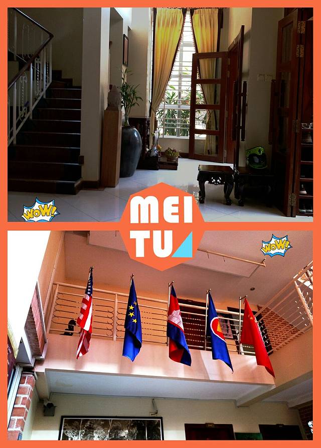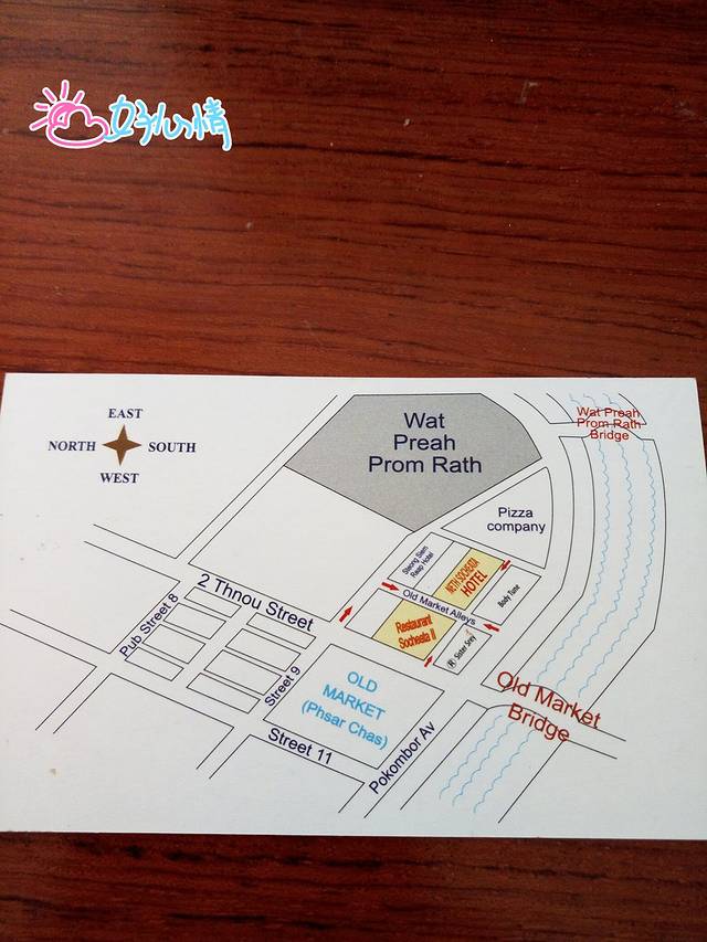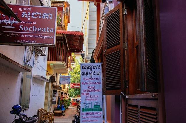 我们住的Neth Socheata Hotel在一个小巷子里,闹中取静,但交通十分便利,巷子的一头通往暹粒河边,一头通往Street09。而Street09路口一边是高棉厨房一边是VIVA(当然发现已经是第二天的事了)巷子很小,TUTU车进不去,于是司机把我们放在Street09,帮我们拎了箱子进去,本来觉得司机等了我们半个多小时想给点小费,结果他也没给我们机会。Check in后,酒店前台帮我们把箱子拎到了四楼房间,耐心给我们介绍了各项设施,包括空调、电视、热水器怎么用都演示了一遍!房门钥匙每次出门要交给前台,但房间有个保险柜,可以把贵重东西锁进去钥匙自己保管。