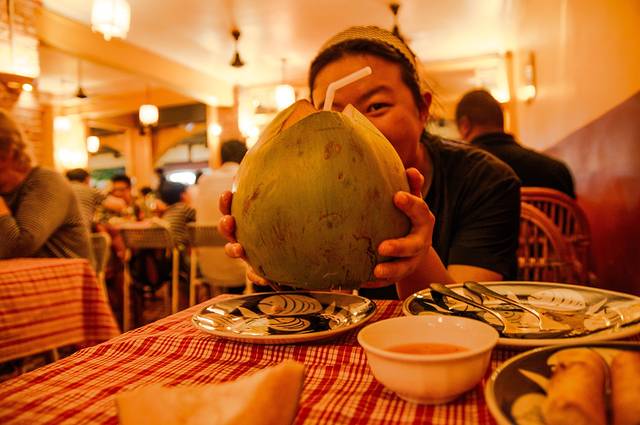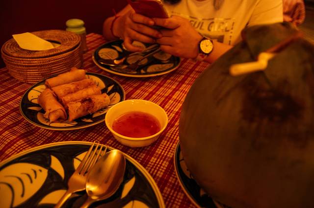 接下来就是晚餐时间,实际高棉厨房离得我们酒店特别近,从小巷靠Street09那一边出来就可以看到了,然而头一天我们居然绕了将近一小时。暹粒吃饭如果不是套餐的话只要点菜就好,都有配饭而且吃完还可以再加。来暹粒的头一餐自然要选择当地最出名的菜式Amok Fish,Amok有一种淡淡的椰浆味,咖喱味并不浓,里面还有洋葱等各种香料,鱼肉则是去骨的很嫩,总的口味是清香带有若有若无的甜的。其实吃得了东南亚香料的人是可以吃得惯的,这么多天吃下来我们觉得柬埔寨餐还挺好吃的。我们还点了特色的炸春卷,超香超脆很好吃偏甜口,里面除了像我们那一样包蔬菜碎以外主料是包芋泥、地瓜泥的,导致我们后面几乎每天都要点。妹妹点的主菜是BBQ牛肉,怎么说呢,暹粒的牛肉怎么做都有点老,估计是因为当地的牛都太瘦了吧,每头基本都能看到肋骨。饮料自然是fruit shake,虽然贵0.5美元,但比街上卖的好喝,而且是满到杯口的一大杯啊。我点的是椰汁,简单粗暴给我上了一个比我脑袋大的椰子——真新鲜果汁无误。