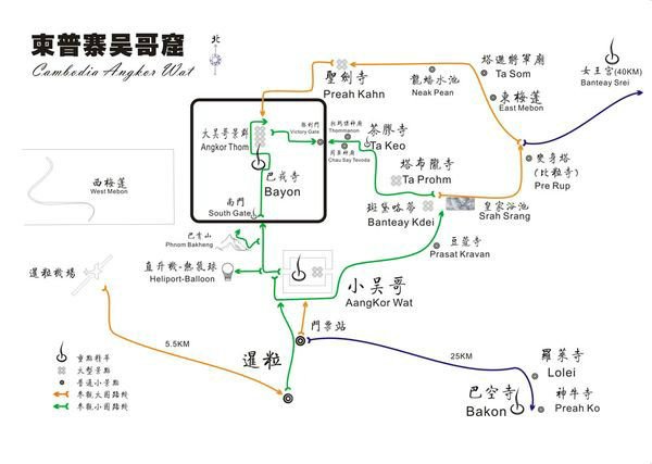1.29吴哥寺日出,小圈:吴哥寺、塔布笼寺,周萨神庙、托玛侬神庙、巴芳寺、巴戎寺,战象平台。