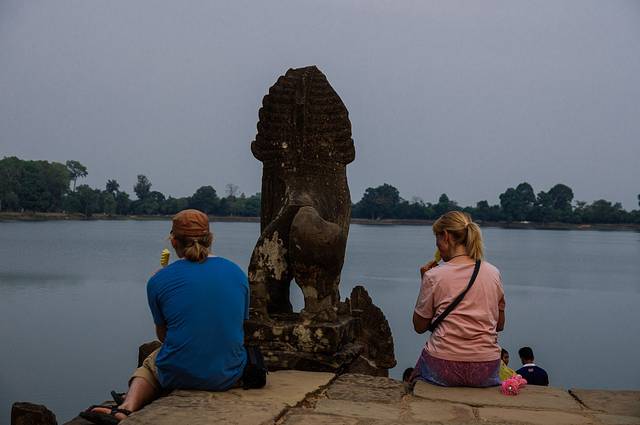 吴哥寺就是大家俗称的小吴哥,从售票处过去还要近半小时。还未到达目的地先映入眼帘的是宽阔的护城河,大概是放假吧,河边挤满了来野营的本地人。虽然看过那么多游记也看过《五月盛放》之类的参考书,但到达实地还是很懵逼。我们直接就把外城墙外的参道边的护城河当成了所谓的荷花池,我还和我妹说:“这荷花池怎么那么大,明天我们千万别站太前面,被挤下去就惨了,看起来好深。”然后我们在这个误认为是拍日出的“荷花池”边上咔擦了好多张照片,下午是顺光青灰的石头都被染成了金黄,不但能拍到外城墙还能拍到吴哥寺的五个塔尖。
