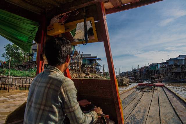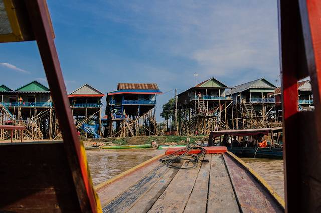 等两位姑娘下来我们就准备去往最后一站洞里萨湖,看浮村和日落。洞里萨湖有三个浮村:越南浮村、空邦鲁和磅克良。磅克良因为比较远所以鲜少有人去,即使是自由行的游客;一般旅行团都会带去越南浮村,口碑很不好;我们此行去的空邦鲁因为和罗洛寺群顺路,所以一般自由行的游客参观完罗洛寺群都会选择去这里看日落。洞里萨湖其实我是纠结了很久才决定去的,因为去过的人都说太贫穷看了心里不好受,但毕竟来了柬埔寨不去看看这东南亚第一淡水湖说不过去。四个人就能开船,于是我们四人上了个英语挺好的小哥开的小船,在黄浊的水道中前行,开了不久就能看到水道两边用竹竿撑起的高脚屋,我们去的时候是旱季,竹竿都露在外面,等雨季的时候湖水会疯涨,那时才是真正的浮村。