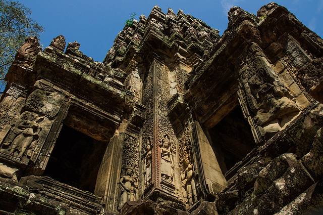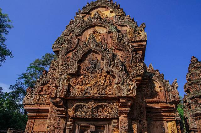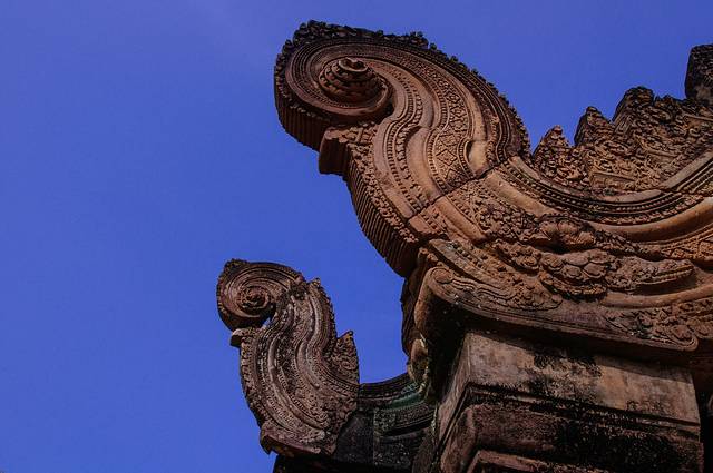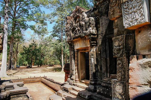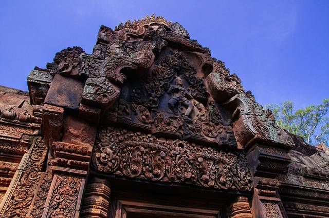 而且不但是佛塔顶端,每一个门的门框,门楣,门柱都雕刻满了不同的花纹,有些甚至是好几层。这些精美的雕刻现在的机器也许都很难做到如此的细致,更何况是如此早的年代,不知要花费多少能工巧匠多少心血和时间。虽然我们现在看到的只是如此精美的石雕,在周达观的《真腊风土记》的记载这些都是彩绘石雕上面还装饰了宝石金箔——那将是怎样华丽的一座庙宇啊。