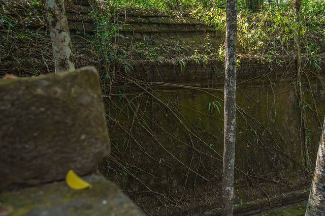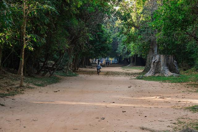 外城城墙上雕刻着巨大的迦鲁达。圣剑寺有3个门,各个门之间的距离都不短,为了方便之后的游览,司机把我们放在了北门。由于我们开门不久就到了,而且大部分游客都不走北门,所以这里特别安静,一位当地的少女骑着老旧的自行车从寥寥无几的游客身边飞驰而过,在林荫小道上留下青春的背影。