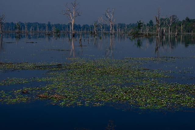 长长的参道两边是两座藏书阁,再前面一点才是拍日出的荷花池。我站在右手边已经干得剩下些池底水的荷花池边沉思,我刚刚究竟是怎么脑抽才会把护城河当荷花池的呢?在右边的荷花池是可以完美拍到吴哥寺的五个塔尖的,但是池水少也没荷花,倒影肯定不好看。