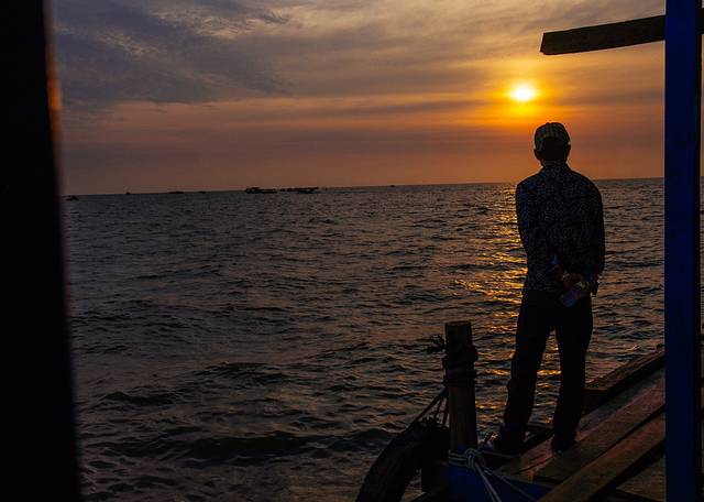 等到五点半船工招呼我们上船,小船儿向着夕阳的方向驶去,能在晃得我们几乎以为要翻的船上拍到如此美丽的夕阳,我觉得来洞里萨湖的决定太正确了。虽然现在是干季,云层并不多,也许比起雨季太阳少了一些衬托,但看到日出日落几率却是比雨季大很多。