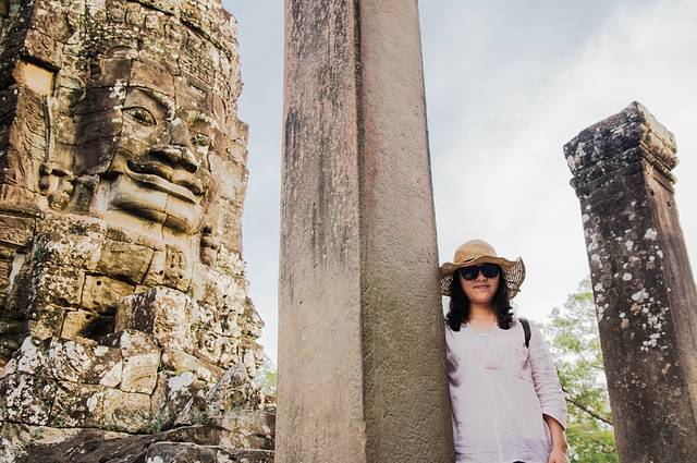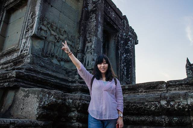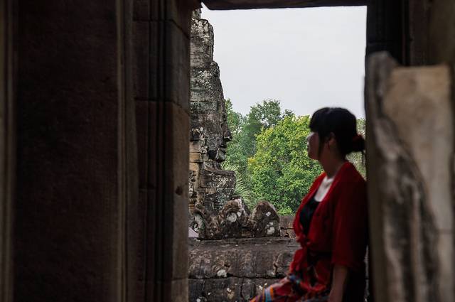 下午四点半我们进到二层之后游客络绎不绝,导游们一边告诉游客们哪里拍照可以和高棉的微笑鼻子对鼻子,但各人指出的位置却各不相同,我们也兴致勃勃的试了试,很多位置照出来的都是几乎贴在一起的,没有遐想空间——这个我无意中自己找到的位置却是最满意的。