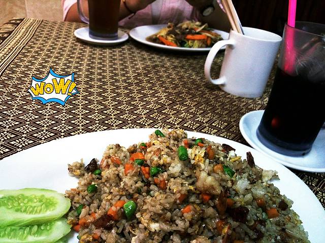 从塔布笼寺出来已经是11点了,我们已经在外面呆了6个小时,一边喝着司机准备的冰水,一边响应吃午饭的决定。司机带我们去的餐厅居然有空调,一盘炒饭6美元左右很大一份,贵也就贵一点吧,能够在空调的房间里好好享受一餐对今天漫长的行程很有帮助。不过葛优瘫了一个多小时,我们又继续开始新的旅程。