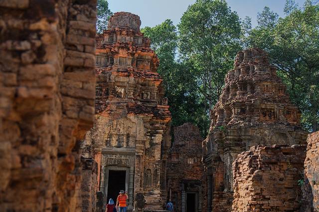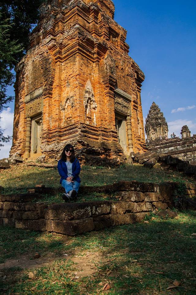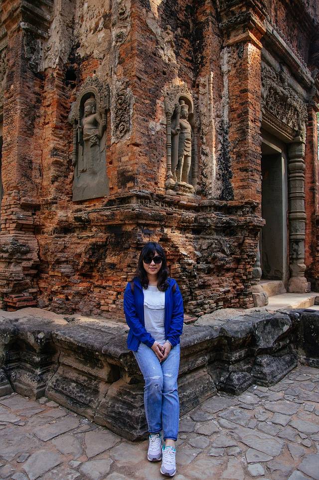 吃了午饭补充完能量,休息够了我们驱车去往罗洛寺群。罗洛寺群有神牛寺、巴孔寺和罗莱寺,目前罗莱寺还在修不对外开放,可以参观剩下两个。罗洛寺群算是吴哥王朝的起源,因陀罗跋摩一世在这里建都,修建水库、神牛寺、巴孔寺,他的儿子为了纪念他也为了镇压不断肆虐的水在水中小岛修建了罗莱寺,但无法解决水的问题,所以就迁都巴肯山。神牛寺是早期典型的红砖建筑灰泥雕刻,即使经过如此漫长岁月的侵蚀,砖墙上残留的雕像依旧美丽。