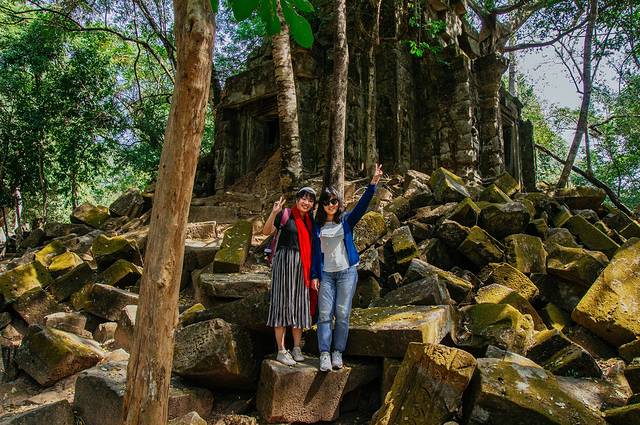 女王宫很小,游客太多,我们绕着寺庙转了一圈便驱车前往崩密列。这是一座吴哥王朝达到鼎盛的苏利耶跋摩二世时期的印度教寺庙,距离吴哥窟景区很远,门票也不包含在吴哥窟的三日票里,一张5美元需要另行购买。我们从女王宫还开了近一小时车才到达,不过司机已经帮我们买好票啦。因为交通非常不便(这里的路是后期才修的),而且建筑损毁非常严重,几乎已经没有修复的可能性了,所以这里一直保持着发现时的样子。崩密列区域很大,穿过参道便到达内城墙的部分,大大小小的石块堆叠在一起,城墙上的塔楼也残缺不全,和塔布笼寺一样许多参天古木已经和建筑长在了一起,只是这里更加破败荒凉,有一种毁灭后的美。